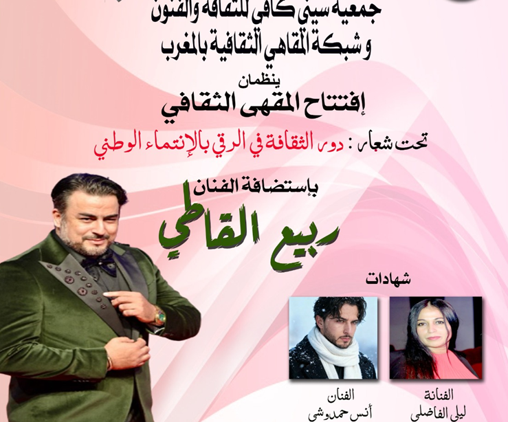 إستمرارا لاستراتيجيتها المتواصلة ، وتحت شعار ،” دور الثقافة في الرقي بالإنتماء الوطني ” تفتتح شبكة المقاهي الثقافية بالمغرب – تأسست في يونيو 2015 – وجمعية سيني كافي للثقافة والفنون بالدار البيضاء ، المقهى الثقافي الأول بإستضافة الفنان ربيع القاطي بمشاركة عازف الناي عبدالغني خدير ، والأوركانيست أنس العلام ،مع شهادات للفنانة ليلى الفاضلي والفنان أنس حمدوشي.
