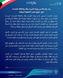 أعلنت المتحدثة باسم وزارة الكهرباء والماء والطاقة المتجددة في الكويت فاطمة جوهر حياة خروج 6 خطوط هوائية للطاقة الكهربائية في عدة مواقع بالبلاد عن الخدمة نتيجة سقوط شظايا مسيرات.