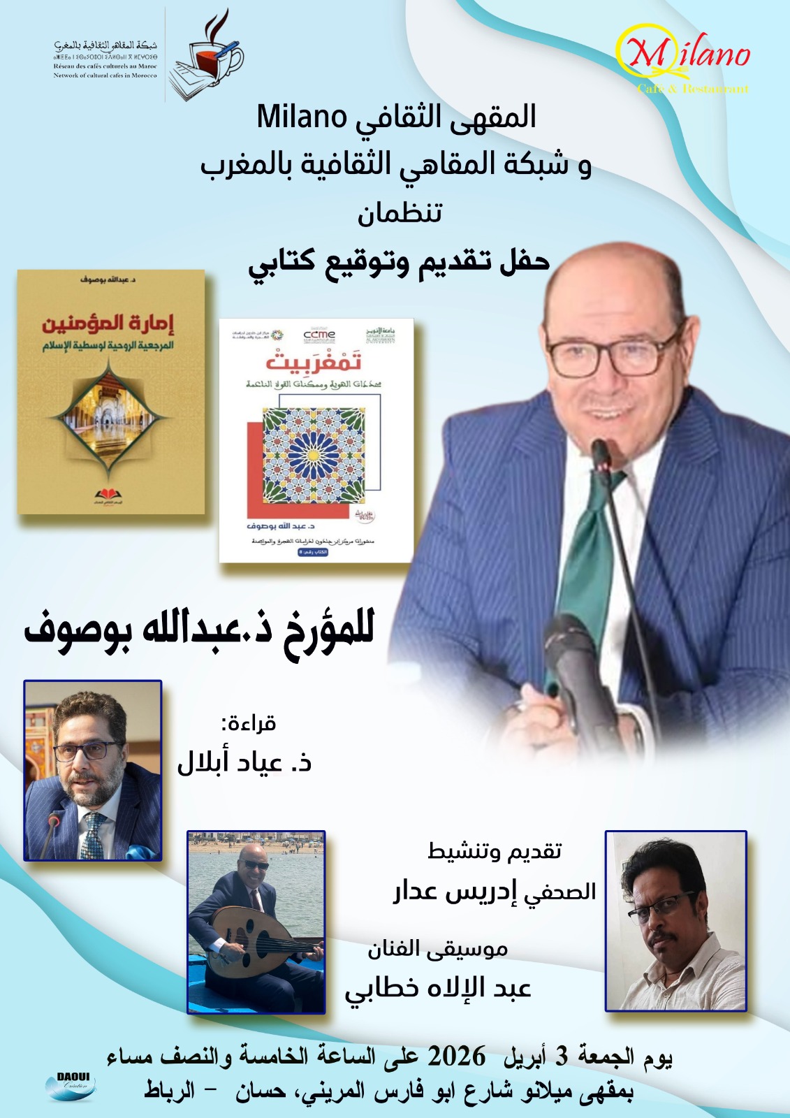 ” تمغربيت ” محددات الهوية وممكنات الهوية و ” إمارة المؤمنين” المرجعية الروحية لوسطية الإسلام للمؤرخ الأستاذ عبد الله بوصوف ، وذلك يوم الجمعة 3 أبريل أبريل 2026 على الساعة الخامسة والنصف مساء بمقهى milano شارع أبو فارس المريني حسان بالرباط .