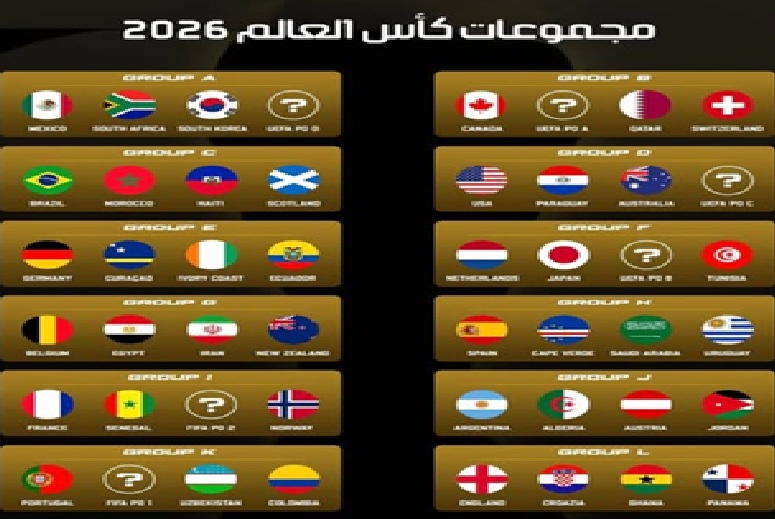 في ما يلي توزيع المجموعات الـ12 في كأس العالم لكرة القدم 2026 بعد ختام التصفيات أمس الثلاثاء:المجموعة الأولى: المكسيك، جنوب إفريقيا، كوريا الجنوبية، ج.التشيك
