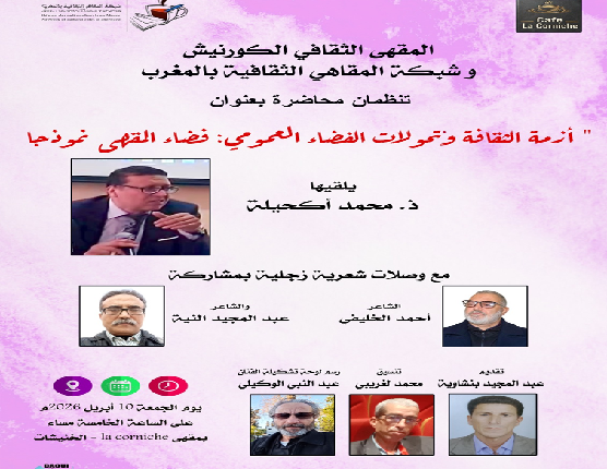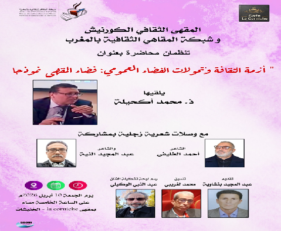 تنظم شبكة المقاهي الثقافية بالمغرب محاضرة بعنوان “أزمة الثقافة وتحولات القضاء العمومي : فضاء المقهى نموذجا ” يلقيها الأستاذ محمد أكحيلة ، مع وصلات شعرية زجلية بمشاركة الشاعران أحمد الخليفي وعبد المجيد النية .