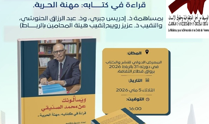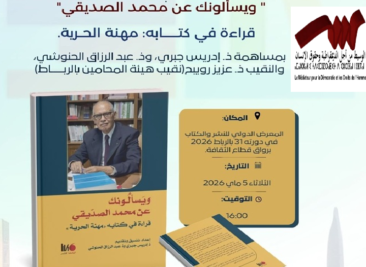 في إطار فعاليات الدورة الـ31 من المعرض الدولي للنشر والكتاب، المرتقب تنظيمها بـالرباط خلال الفترة ما بين 30 أبريل و10 ماي 2026، ينظم الوسيط من أجل الديمقراطية وحقوق الإنسان، يوم الثلاثاء 5 ماي، لقاءً ثقافياً لتقديم وقراءة مؤلف جماعي بعنوان “ويسألونك عن محمد الصديقي: قراءة في كتابه مهنة الحرية”.