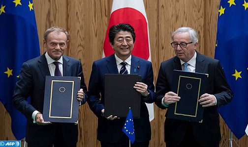 والاتفاق، الذي وقع عليه في طوكيو كبار مسؤولي الاتحاد الاوروبي ورئيس الوزراء الياباني شينزو آبي، هو اكبر اتفاق للاتحاد الاوروبي وينشئ منطقة تبادل حر تشمل تقريبا ثلث الناتج المحلي الإجمالي في العالم.
