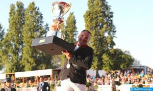 فاز الغالي بوقاع ممتطيا الفرس “كول رانينغ، اليوم الأحد، بالجائزة الكبرى لصاحب الجلالة الملك محمد السادس للقفز على الحواجز التي احتضنتها حلبة الفروسية بالمدرسة الملكية للخيالة بتمارة.
