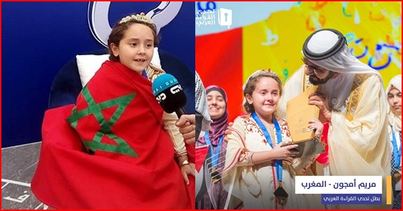 توجت التلميذة المغربية مريم أمجون اليوم الثلاثاء بلقب “تحدي القراءة العربي” 2018 وسلم الشيخ محمد بن راشد آل مكتوم نائب رئيس دولة الامارات رئيس مجلس الوزراء حاكم دبي ،خلال حفل نظم بدبي ،الجائزة للتلميذة أمجون التي تدرس بمدرسة الداخلة بتيسة التابعة لتاونات بأكاديمية فاس مكناس الجائزة بعد مشاركتها الناجحة فيي المسابقة التي تخطت في دورتها الثالثة 10.5 مليون مشاركة من التلميذات والتلاميذ من مختلف البلدان العربية وخارجها .