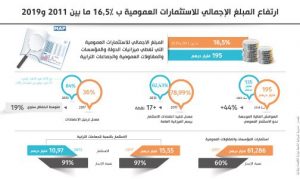 سجل المبلغ الاجمالي للاستثمارات العمومية التي تغطي ميزانيات الدولة والمؤسسات والمقاولات العمومية والجماعات الترابية، ارتفاعا بنسبة 16.5 في المائة ما بين 2011 و2019، إلى 195 مليار درهم، وذلك بحسب مديرية الميزانية التابعة لوزارة الاقتصاد والمالية. وأشارت المديرية، في ملخص لمذكرة حول التوزيع الجهوي للاستثمار المرافقة لقانون المالية لسنة 2019، أيضا إلى الارتفاع المضطرد للهوامش المالية الموجهة نحو الاستثمار العمومي الذي انتقل من 135 مليار درهم سنة 2009 إلى 195 مليار درهم سنة 2018، بزيادة فاقت 44.4 في المائة.