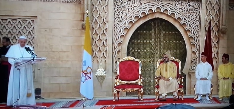 ألقى قداسة البابا فرانسيس، اليوم السبت خطابا، وذلك خلال مراسم الاستقبال الرسمي الذي خصه به أمير المؤمنين صاحب الجلالة الملك محمد السادس بباحة مسجد حسان بالرباط.