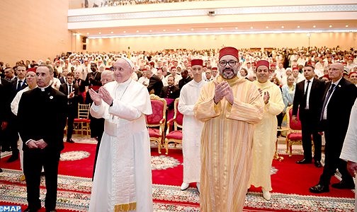 ام أمير المؤمنين صاحب الجلالة الملك محمد السادس، نصره الله، مرفوقا بصاحب السمو الملكي ولي العهد الأمير مولاي الحسن وصاحب السمو الملكي الأمير مولاي رشيد، وقداسة البابا فرانسيس، اليوم السبت بالرباط، بزيارة لمعهد محمد السادس لتكوين الأئمة المرشدين والمرشدات.