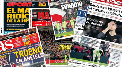 أما صحف مدريد، فأعربت عن صدمتها أكثر من ازدرائها بالغريم التقليدي. وكتبت “آس”، “صدمة في ليفربول”، مضيفة “كارثة جديدة لبرشلونة في دوري الأبطال والثلاثية تتبخر” في إشارة لما كان يسعى إليه الفريق الكاتالوني المتوج بلقب الدوري الإسباني، لإحراز ثلاثية الدوري والكأس المحليين ودوري الأبطال تكرارا لإنجاز عامي 2009 و2015.