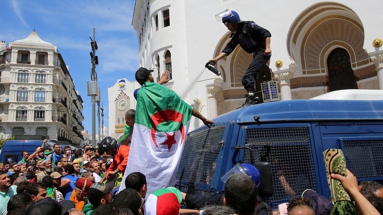 تداول ناشطون على مواقع التواصل الاجتماعي مقطع فيديو، يظهر شرطيا جزائريا وهو يرشّ متظاهرين بالغاز المسيل للدموع قبل أن يعتلي متظاهران عربته ويدفعانه أرضا.
