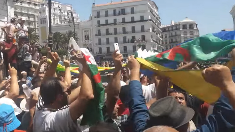 وأظهرت مقاطع فيديو تداولها رواد مواقع التواصل الاجتماعي عشرات المتظاهرين وهم يرفعون الأعلام الثقافية الأمازيغية في الجمعة الـ18 منذ بدء الاحتجاجات في الجزائر.