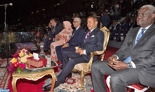بعد ذلك، تم أداء أغنية المسيرة الخضراء “نداء الحسن”، قبل أن ينطلق الحفل الذي نظم بهذه المناسبة، ويتضمن مقدمة للعرض وعشر لوحات، ثم أغنية بمناسبة الذكرى 56 لميلاد صاحب الجلالة الملك محمد السادس نصره الله. وفي ختام هذا الحفل سلمت جمعية اللجان الوطنية الأولمبية الإفريقية لصاحب الجلالة الملك محمد السادس قلادة الاستحقاق الأولمبي الإفريقي.